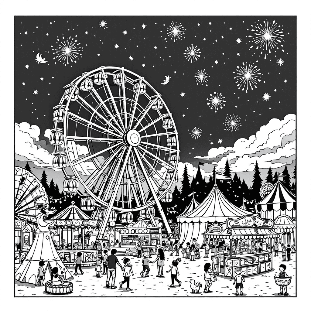 Welcome to the Circus Carnival! Get ready to color in all the exciting attractions, like clowns, acrobats, and animals performing amazing tricks. Use your imagination to bring this colorful world to life!